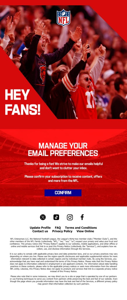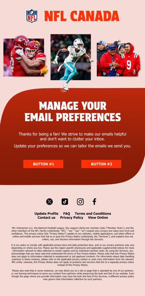 Examples of email designs I drafted for International fan engagement with NFL Canada and UK/IRE.